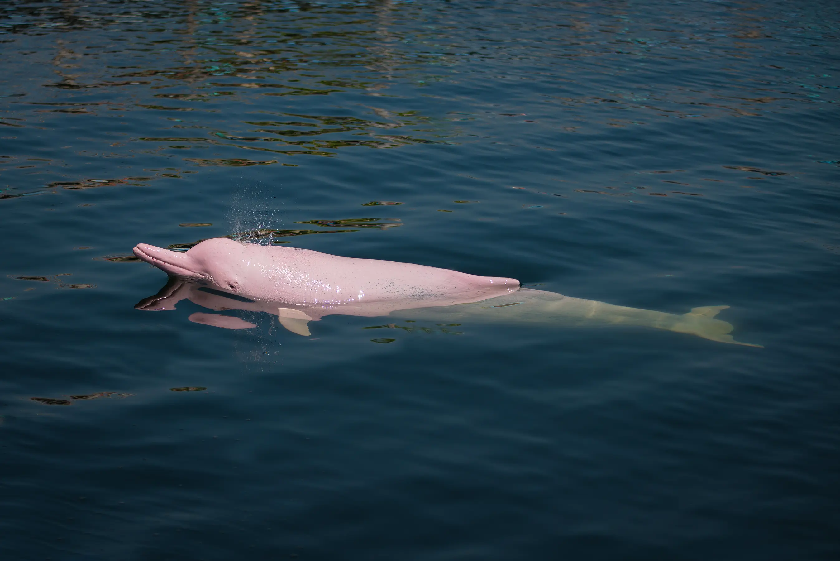 The pink river dolphin is a rare and beautiful creature which inhabits the waters of the Peruvian Amazon. These dolphins are actually born gray and slowly turn pink as they age with male dolphins being strikingly more pink than their female counterparts. Their final color can also be influenced by their behavior, capillary placement, diet, and exposure to sunlight.